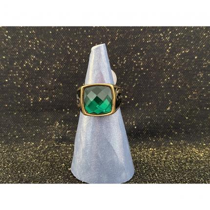 Chevalière doré avec pierre verte.